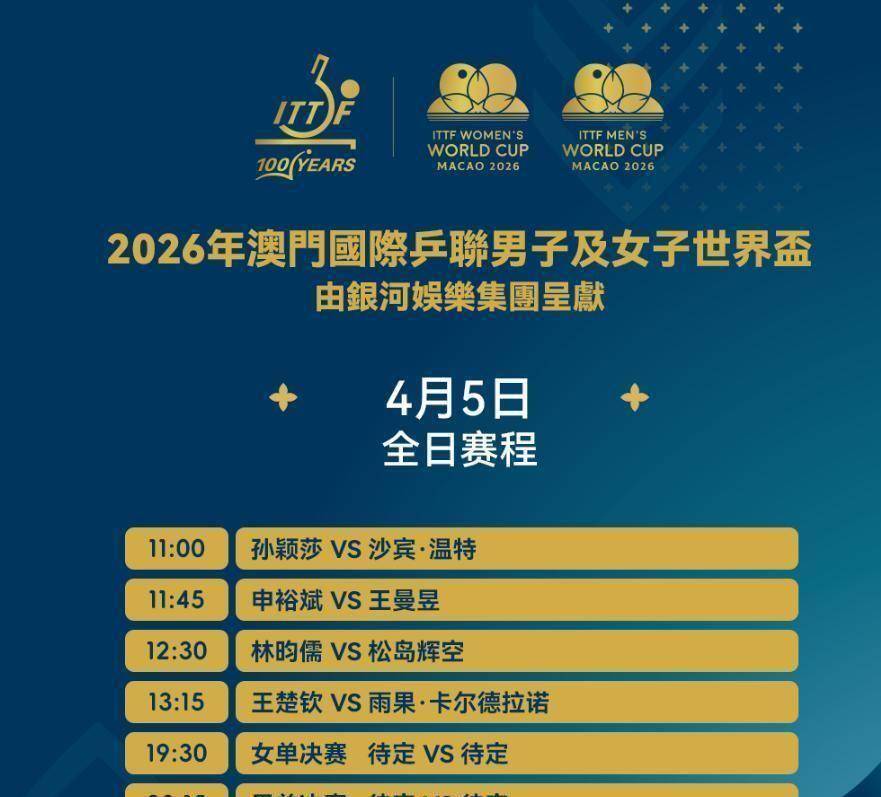足球直播,欧洲杯直播,体育直播,球客直播,雷速体育,篮球直播,风驰直播,NBA直播,英超直播,足球比分,足球赛事,意甲,欧冠,世界杯,世界杯直播,村超,贵州村超,波胆,角球,串球,大小球今天,2026年4月5日,澳门银河综艺馆的乒乓球台将成为全世界球迷目光的焦点。 国际乒联单打世界杯迎来了最终的决战日,男女单打两枚金牌将在今晚全部产生。 对于中国乒乓球队来说,这是捍卫荣誉的关键一天,孙颖莎、王曼昱、王楚钦三位主力选手将分别出战半决赛,向决赛席位发起冲击。