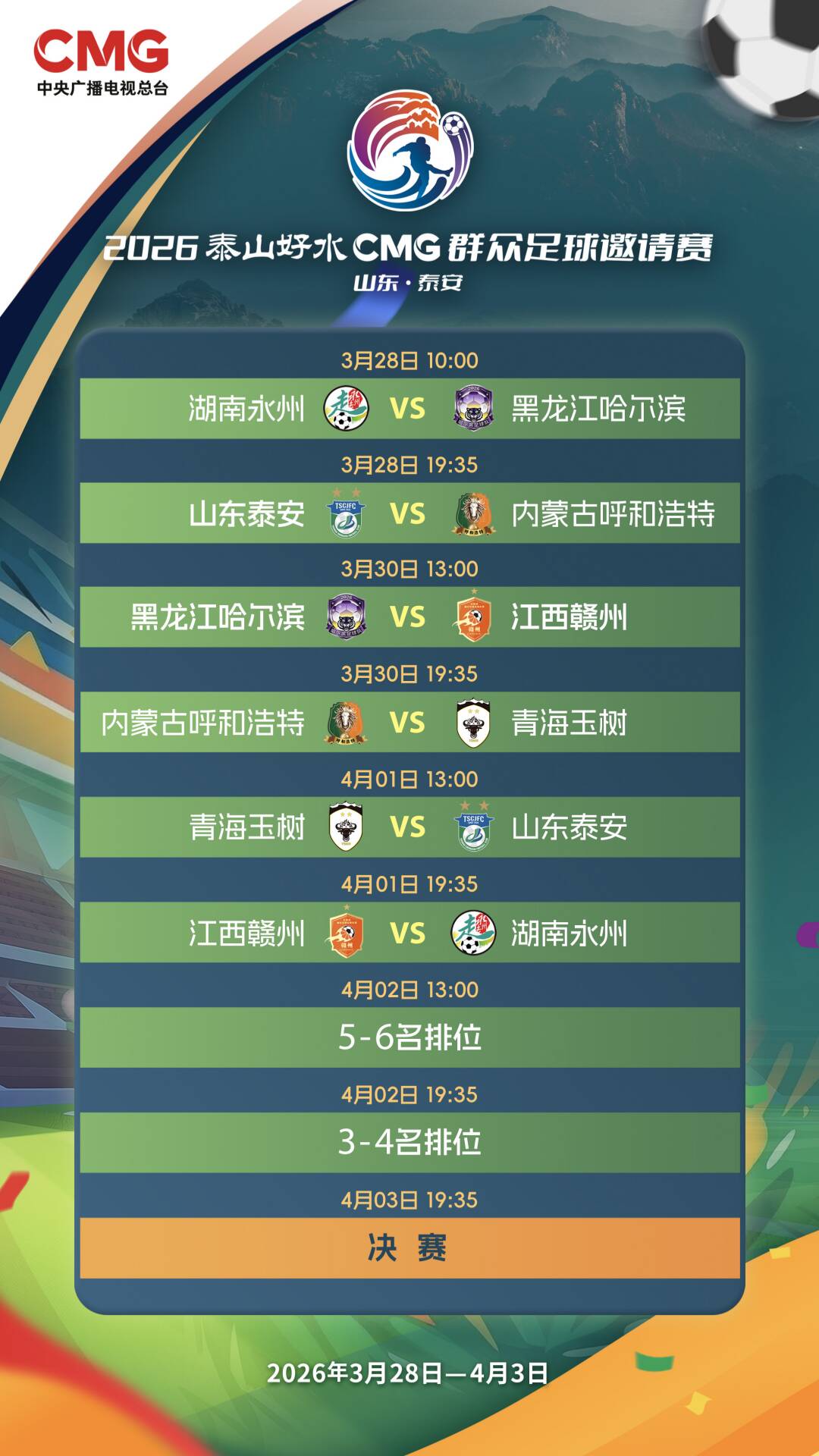 3月28日至4月3日, 2026泰山好水CMG群众足球邀请赛将在山东泰安盛大开幕。来自全国各地的六支群众足球强队将齐聚泰山脚下,用拼搏与汗水书...[详细]
